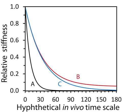 Figure 3 – Relative stiffness reduction in each case above over a hypothetical implant course.
