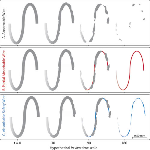 Figure 2 – Absorbable filament time series based on galvanically active design and experimental observation. (A) Fully absorbable filament may give rise to some debris over the course of device hand-off to tissue. Generation of these debris may not compromise device function if tissue has adequately enveloped the material. (B) A partially absorbable design with a more cathodic, non-degrading core can hand-off most of the mechanical load due to high loss of flexural rigidity, while reducing the risk of premature debris formation. (C) An absorbable safety element, that is somewhat more cathodic than the bulk structure, can provide both full absorption and reduced risk of premature debris formation.