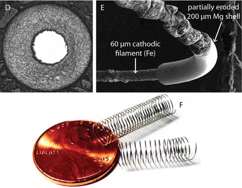 Figure 1 - Panel D shows the cross section of a 200 ?m magnesium alloy (LAEX6410) wire with a 65 ?m high purity (99.95%) iron core; this wire was processed to a strength level exceeding 600 MPa. Panel E shows a section of wire coil (F) that was exposed to body temperature serum.