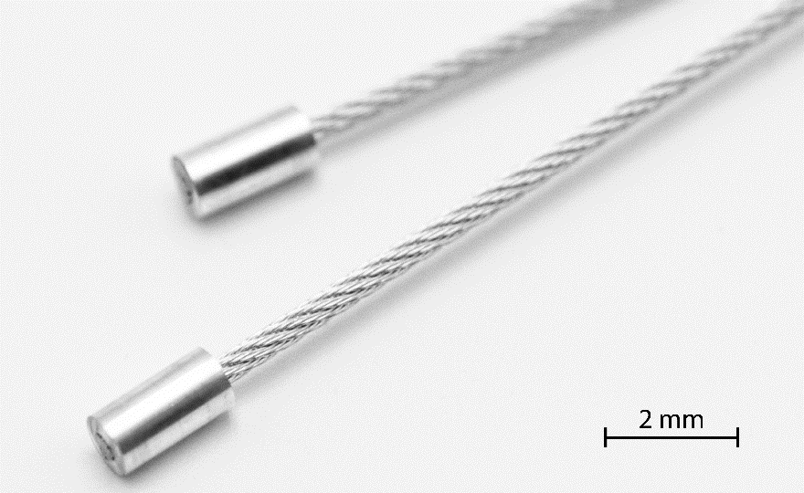 Figure 4. A simple 7x7x50 µm; 0.450 mm OD cable construction with swaged fittings (note: 2 mm scale bar is near true in the optical focal plane). This common wire construct composed of UHS material with a greater than 5 GPa strength level will achieve extremely high stiffness, good surface hardness and a break load exceeding 425 N (103 lb).