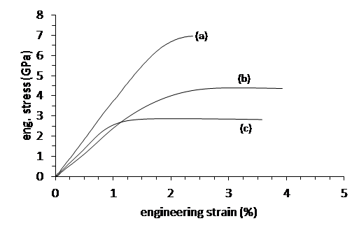 Figure 3 shows a comparison in tensile behavior between a high strength, warm drawn 100 µm tungsten wire, cold drawn 100 µm Mo41Re wire and cold drawn 7 µm Mo41Re wire. Comparing the 100 µm samples, at room temperature, axial specific work-energy to fracture in a tensile test increased from 87 to 129 mJ/mm^3 in the UHS Mo-Re wire giving an improvement in fracture energy of greater than 40% compared to drawn tungsten. Curve (a) for the Mo41Re Ø 7 µm wire provides a superlative example of ultimate tensile strength at 6.9 GPa (greater than one million pounds per square inch) with a 0.2% yield strength of 6.2 GPa, a measured Young’s elastic modulus of 371 GPa, 2.3% engineering strain to fracture and a specific work energy to fracture of 99.6 mJ/mm3.