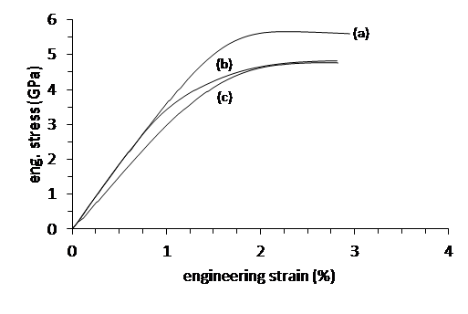 Figure 2 shows the room temperature engineering stress-strain response of 25 mm diameter Mo41Re (a) as well as similarly processed W26Re (b) and Mo47Re (c). In these tests, at greater than 90% cold work, all samples maintained ductile yielding with uniform elongation exceeding 2.5% and strength levels greater than 4.5 GPa across all samples. The tensile strength and elongation to fracture of the Ø 25 µm Mo41Re was the greatest at 5.66 GPa and 3% engineering strain respectively giving a specific work energy to fracture of about 120 mJ/mm3, a 0.2% yield strength of 5.00 GPa, and a measured Young’s elastic modulus of 370 GPa.