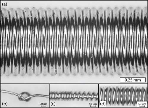 Figure 1. Formed wires: (a) – 71 µm Mo47Re wire drawn to an ultimate strength level of 5.1 GPa coiled to 0.65 mm OD; (b) – Fine drawn 25 mm Mo41Re wire drawn to an ultimate strength level of 5.6 GPa knotted to a surface strain exceeding 30% without apparent crack formation or loss of surface luster; (c) Same wire as (b) self-coiled to a surface strain exceeding 40% without apparent cracking; (d) Fine drawn 25 µm W26Re wire drawn to an ultimate strength level of 4.7 GPa coiled to 0.18 mm OD without loss of surface luster.