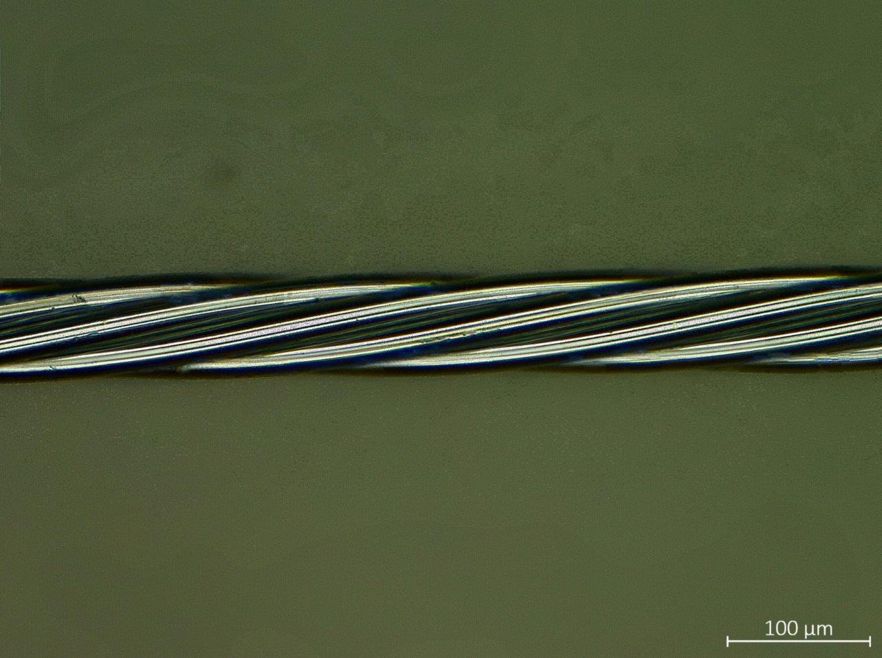 Figure 5. Stranded Wires – 25.4 µm Mo41Re wire drawn to an ultimate strength level of 5.6 GPa stranded to 76 µm OD