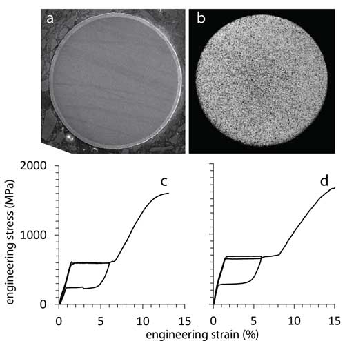 Figure 1 – SEM wire-sections showing (a) Superelastic, Platinum-DFT®-95%NiTi#1 comprising an outside diameter of 0.050 mm with a 0.50 micron coherent and highly concentric pure platinum shell; (b) Solid superelastic 0.05 mm NiTi#1 wire; Stress-strain response of (c) Heat straightened Pt-DFT®-95%NiTi; and (d) Heat straightened NiTi#1 (Ti-50.8 at.%Ni)